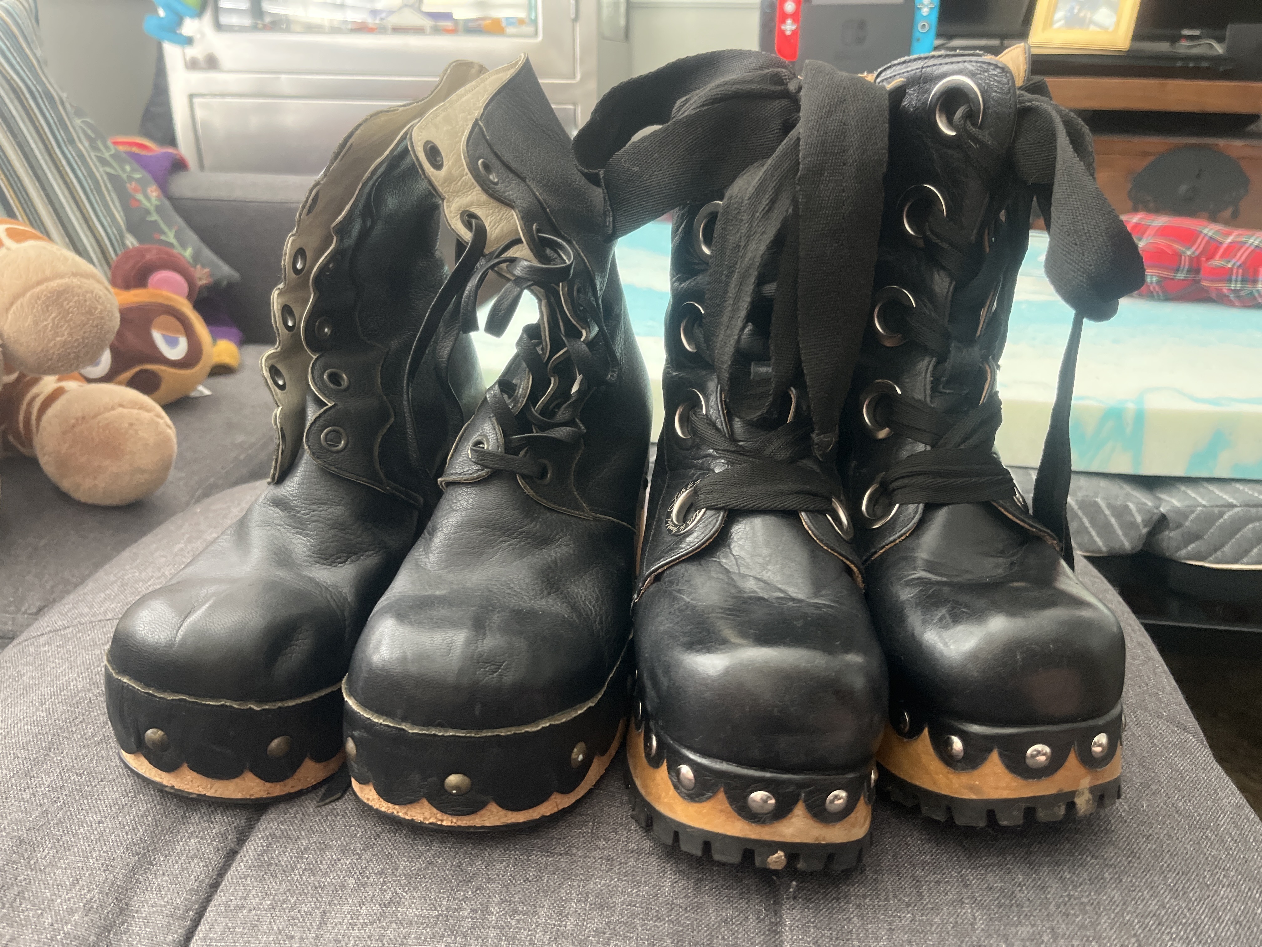 Pretty neat! Both are leather but the vintage ones (left) have a cork sole instead of the Fluevogs wooden soles. I do plan to sells the vintage shoes once I clean them up a bit more.